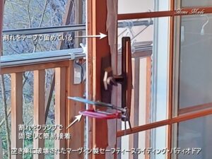 空き巣はここから侵入することは出来なかったようですが、ドアの木枠が写真のように割れて裂けてしまいました。