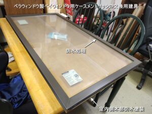 今回、交換用の新しい建具をメーカーに作ってもらいましたので、取付け前に屋外側のガラスの防水処理を行い、室内側の木部もカナダのパラペイントで防水塗装を実施しております。
