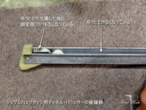 お客様から頂いた写真を見ると、バランサーの吊りヒモが完全に外れてしまい、それによってバランサーを窓枠に固定する為のフックもなくなっている状況です。