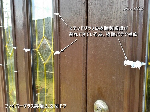 玄関ドアのスタンドグラスの周囲にはガラスを固定する為の額縁材が取り付けられているのですが、劣化すると割れてきます。割れる前に定期的に塗装して、保護する必要がありますね。