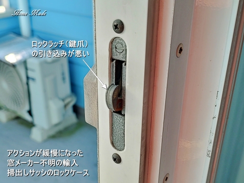 ロックレバーを上げて鍵を解除した状態ですが、ロックラッチが少し出たままになっています。正常な状態ではありませんから、すぐに交換が必要です。