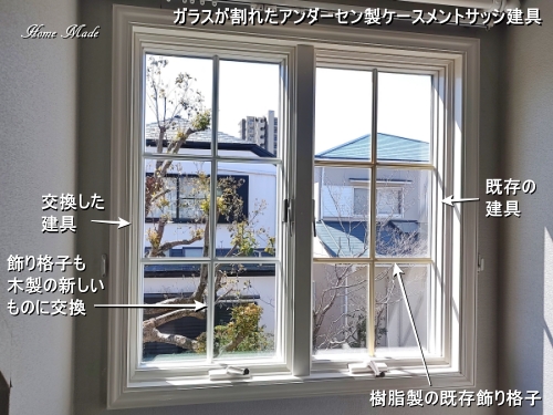 ガラスが割れたアンダーセン製ケースメントサッシ建具