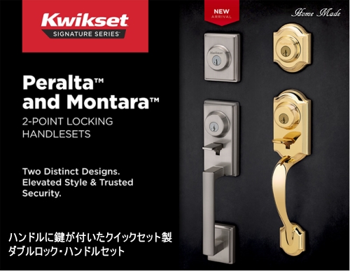 Kwiksetの新しいハンドルセット。コンパクトな本体に鍵が付いていて、デッドロックの鍵と共にダブルで鍵が掛けられます。