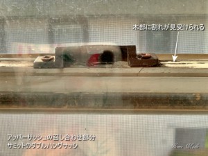 こうして窓を開けた状態にしてみると、ロックの受け金物の辺りに塗装の剥がれや木部の割れがあるのが分かります。こういう状態は、木部に何らかの湿気や水分が入り込み、木を劣化させている可能性があると思います。