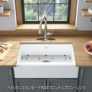その一例が、この写真。キッチンシンクと正面のフロントエプロンが一体化されたアメリカンスタンダード社の真っ白なシンクと輸入のキャビネット。