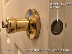 ただ、ご覧のようにドアラッチの鍵爪が引っ込んだまま出てこない状況ですから、当然鍵も掛けられません。トイレで鍵が掛けられないというのは、男性ならまだしも女性や若い娘さんなんかは、相当ストレスになるでしょうね。