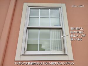 こちらの写真が交換前のガラスが割れた写真ですが、下窓ガラスに養生テープが張り付けてあります。
