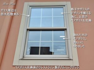 普通の業者さんだと上げ下げ窓の下窓ガラスの交換の仕事だと、下窓建具に挿入されているペアガラスを交換するだけですが、それだとガラスの質感や格子のデザインが上・下の建具で揃わなくなる恐れがあります。