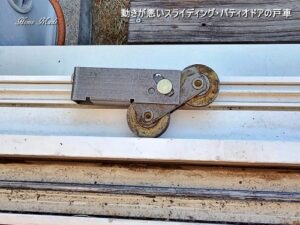 写真は、ドアをひっくり返して戸車部品を外した様子です。車輪の部分に汚れが付着しているのが分かりますが、この汚れが車輪の中にも入り込んでいて、2つの車輪共全く動かなくなっていました。