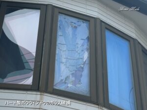 ここまで割れているといつ細かな破片が下に落ちるか分かりませんから、出来るだけ早めに交換してあげないと、人やものへの被害が心配される事態だと思います。(因みに、このガラスはペアガラスですから、雨風や防犯上の心配がすぐに発生することはないのが不幸中の幸いです)