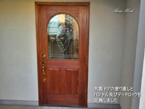 愛知県のお客様の輸入住宅にお邪魔して、玄関ハンドルやデッドロックといった金物の交換、表面が傷んだ木製ドアの塗り直しを行いました。