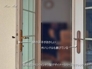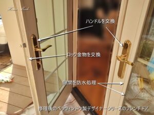 写真は、それらをフレンチドアに装着し、開閉調整やドア外部の防水処理を行って、修理・メンテナンスを完了した様子です。