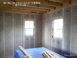 セルロースの断熱材は、元々木の繊維ですから、輸入住宅に採用される2x4工法のような木造構造物との相性に優れています。勿論、木の柱材と同様に調温機能や吸放湿作用も発揮してくれますから、室内の仕上げにベーパーバリアやビニール・クロスを張るのは以っての外。