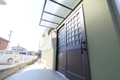 ドアは、極力引き戸にしたいという希望で、玄関ドアも引き戸になりました。玄関ひさしもガラスをはめ込んだ特注です。